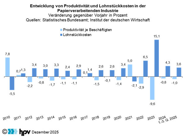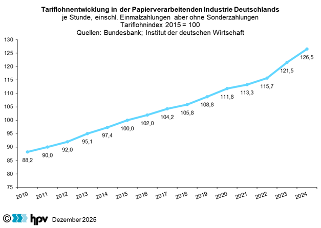 - Nach Berechnungen der Deutschen Bundesbank ergab sich für die Papier-verarbeitende Industrie kalenderjährlich und je Stunde gerechnet im Jahr 2024 eine Kostenbelastung von 4,1 Prozent. Dabei sind Nebenvereinbarungen wie Urlaubsgeld, Jahressonderzahlungen, vermögenswirksame Leistungen oder Einmalzahlungen wie Inflationsausgleichsprämien berücksichtigt. Für den Durchschnitt aller Branchen ermittelte die Bundesbank 2024 einen Zuwachs von 6,2 Prozent. Im ersten Quartal 2025 schwächte sich der gesamtwirtschaftliche Anstieg vorübergehend (auf 1,0 Prozent) ab. Im zweiten Quartal lag der Zuwachs allerdings bei 5,8 Prozent. Aufgrund des Wegfalls von Inflationsausgleichsprämien ergab sich im dritten Quartal dann ein Rückgang um 0,1 Prozent. Für das gesamte Jahr erwartet der Sachverständigenrat einen Tariflohnanstieg von 2,5 Prozent. Dieser beschleunigt sich 2026 auf 2,8 Prozent.