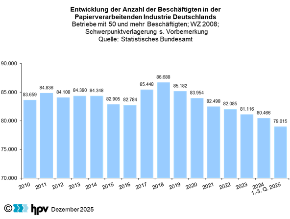- Die Anzahl der Beschäftigten in der Papierverarbeitenden Industrie sinkt seit dem Höchststand von 2018 kontinuierlich. Im Durchschnitt des Jahres 2018 waren in den Betrieben mit 50 und mehr Beschäftigten 86.688 Personen beschäftigt, 2024 waren es durchschnittlich 80.466 und in den ersten drei Quartalen 2025 noch 79.015.