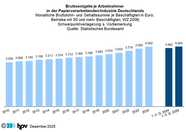 - Das monatliche Bruttoentgelt je Beschäftigten belief sich in der Papierverarbeitenden Industrie in den ersten drei Quartalen 2025 auf durchschnittlich 4.064 Euro. Gegenüber dem Vorjahreszeitraum bedeutet dies einen Anstieg von 102 Euro oder 2,6 Prozent. Je Stunde gerechnet fiel der Anstieg mit 2,7 Prozent in etwa gleich stark aus.