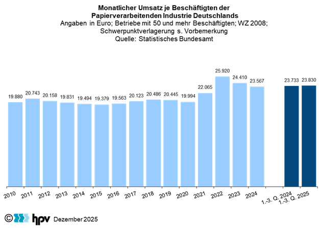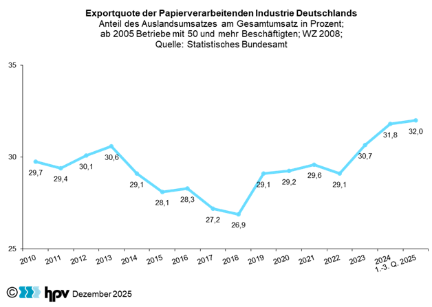 - In relativer Betrachtung haben die Auslandsmärkte für die deutsche Papier-verarbeitende Industrie in den ersten drei Quartalen mit einer Exportquote von 32,0 Prozent gegenüber dem entsprechenden Vorjahreshalbjahr weiter an Bedeutung gewonnen – damals betrug der Umsatzanteil des Auslands 31,6 Prozent. Gleichzeitig wurde der Rekordwert des Gesamtjahres 2024 von 31,8 Prozent übertroffen.