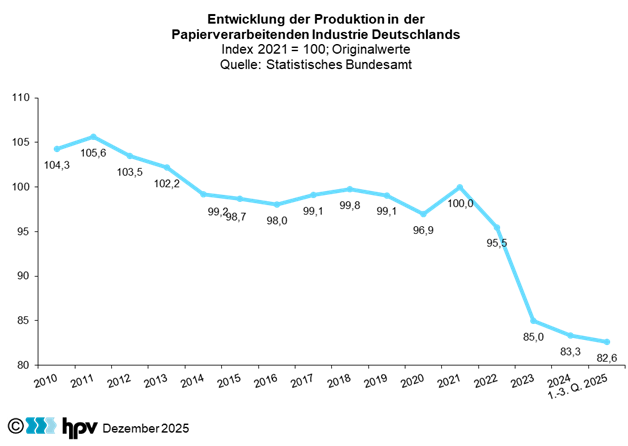 - In der langfristigen Betrachtung verliefen die Preise für Erzeugnisse der Papierverarbeitung und die Preise für den Gesamtindex der gewerblichen Produkte ohne Energie lange Zeit annähernd parallel. Im Jahr 2022 legten die Preise für die Erzeugnisse der Papierverarbeitung aber überdurchschnittlich stark zu, sodass der Preisindex im Jahresdurchschnitt 2022 um gut 9 Prozentpunkte höher lag als bei den gewerblichen Produkten ohne Energie. Im Durchschnitt des Jahres 2023 ist es bei einem ähnlich hohen Abstand geblieben, wobei sich der Abstand der beiden Indexreihen im Jahresverlauf verringerte. Seit Anfang 2024 laufen die Preise wieder annähernd parallel. Zuletzt – im September 2025 – betrug der Abstand 5,5 Prozentpunkte.