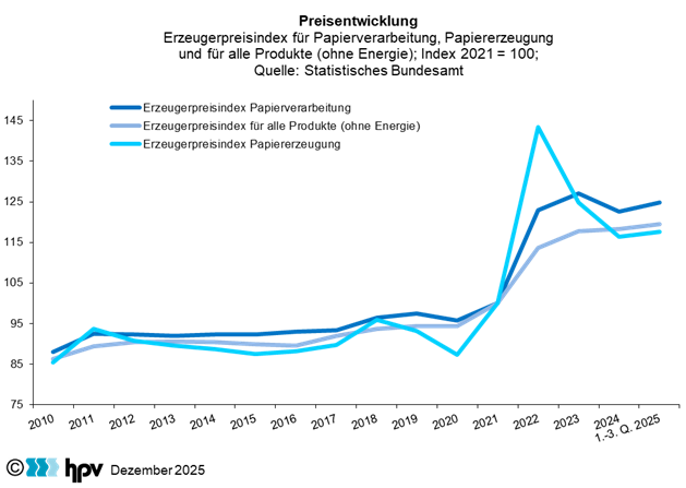 - Der Erzeugerpreisindex in der Papierverarbeitenden Industrie lag im Durchschnitt der ersten drei Quartale 2025 bei 124,8 Prozent. Damit liegt er einerseits knapp über dem Niveau der Jahre 2022 und 2024, verfehlt aber andererseits den Rekordwert des Jahres 2023 um 1,7 Prozent. Gemessen an dem starken Anstieg der Erzeugerpreise von Mitte 2021 bis Januar 2023 um ein Drittel und dem darauffolgenden Rückgang bis Februar 2024 um knapp 9 Prozent, sind die Preise seitdem sehr stabil.