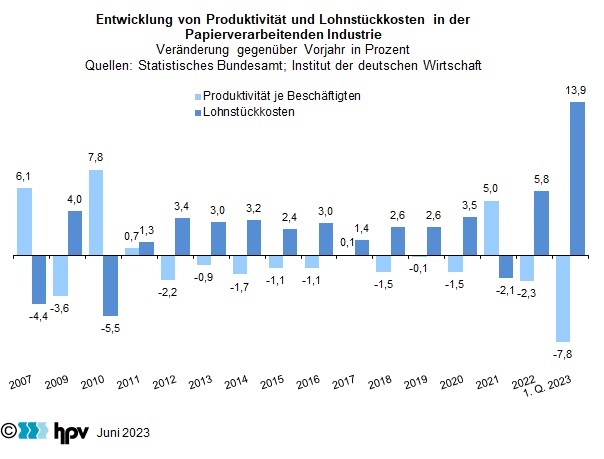 - Im langfristigen Vergleich fällt die aktuelle Bruttolohnerhöhung der Papierverarbeitenden Industrie überdurchschnittlich aus. Während die Bruttolöhne je Beschäftigten zwischen 2010 und 2022 im Durchschnitt um 1,9 Prozent pro Jahr stiegen, nahmen sie 2021 bereits um 2,8 Prozent zu. Der Lohnanstieg hat sich im Jahr 2022 auf 4,9 Prozent beschleunigt. Je Stunde gerechnet fiel der Anstieg des Bruttolohns im Jahr 2022 mit 5,7 Prozent aufgrund der von den Beschäftigten weniger geleisteten Arbeitsstunden noch höher aus als je Beschäftigten gerechnet. Auch im ersten Quartal 2023 fiel der Anstieg gegenüber dem ersten Vierteljahr 2022 mit 5,9 Prozent stärker aus als je Beschäftigten gerechnet.