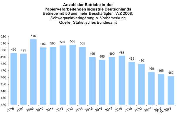 - In der Papierverarbeitenden Industrie gab es im Jahr 2022 insgesamt 465 Betriebe mit mindestens 50 Beschäftigten. Im ersten Quartal 2023 waren es drei Betriebe weniger.