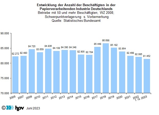 - Die Anzahl der Beschäftigten in der Papierverarbeitenden Industrie ist seit dem Höchststand von 2018 kontinuierlich rückläufig. Waren im Durchschnitt des Jahres 2021 noch 82.498 Personen beschäftigt, waren es im Jahr 2022 mit 82.085 etwas weniger Personen. Im ersten Quartal 2023 belief sich der Durchschnittswert auf 81.452.