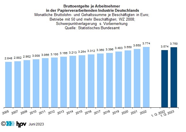 - Das monatliche Bruttoentgelt je Beschäftigten belief sich in der Papierverarbeitenden Industrie im ersten Quartal 2023 auf 3.750 Euro. Gegenüber dem entsprechenden Vorjahresquartal bedeutet dies einen Anstieg von rund 176 Euro.
