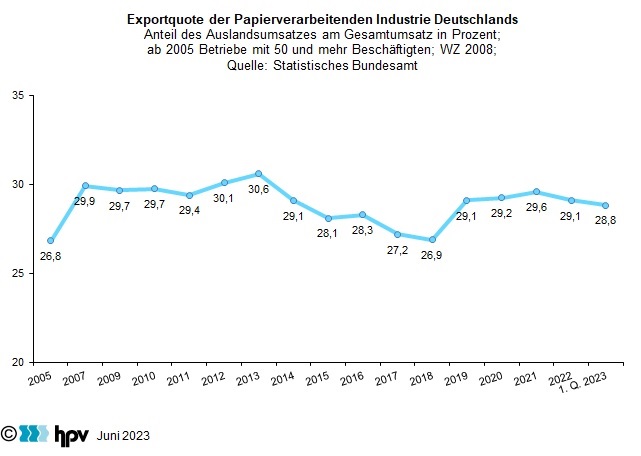 - In relativer Betrachtung haben die Auslandsmärkte für die deutsche Papierverarbeitende Industrie im ersten Quartal mit einer Exportquote von 28,8 Prozent gegenüber dem Vorjahr ihre Bedeutung knapp gehalten – seit 2019 pendelt die Exportquote der Papierverarbeitenden Industrie um die 29 Prozent.