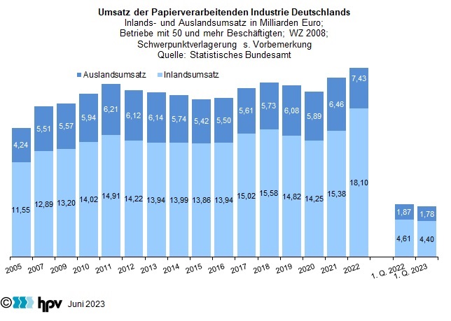 - Im ersten Quartal 2023 lag der Gesamtumsatz in der Papierverarbeitenden Industrie bei rund 6,18 Milliarden Euro. Gegenüber dem Umsatz des gleichen Vorjahreszeitraums, der bei 6,48 Milliarden Euro lag, ergab sich ein Minus von 0,31 Milliarden Euro. Dabei belief sich der Inlandsumsatz auf 4,4 Milliarden Euro und der Auslandsumsatz auf 1,78 Milliarden Euro. Damit lagen beide Werte unter ihrem jeweiligen Vorjahresniveau. Der Anteil der Inlandsumsätze am Gesamtumsatz lag im ersten Quartal bei 71 Prozent. Diese Quote ergab sich auch im ersten Quartal 2022.
