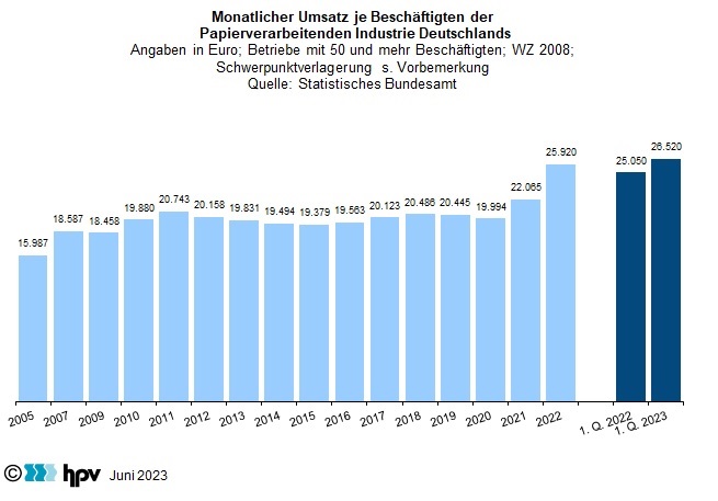 - Aufgrund der rückläufigen Beschäftigung stieg der Umsatz je Beschäftigten in der deutschen Papierverarbeitenden Industrie im ersten Quartal 2023 gegenüber dem gleichen Vorjahresquartal an. Während der Pro-Kopf-Umsatz vor einem Jahr noch bei 25.050 Euro lag, waren es zuletzt 26.520 Euro. Das entspricht einem Anstieg vom fast 6 Prozent.