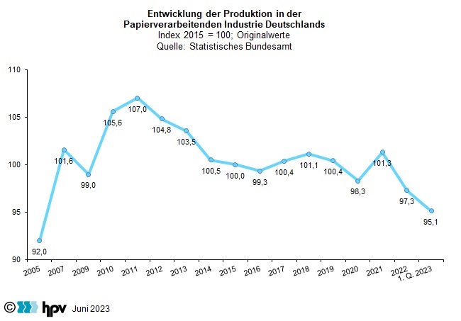 - Obwohl in den ersten vier Monaten des Jahres 2021 für die Bevölkerung ein strenger Lockdown herrschte, nahm die Produktion in der Papierverarbeitenden Industrie im Jahr 2021 (Originalwerte) um 3,0 Prozent zu. Dadurch wurden die Produktionsrückgänge von 0,7 Prozent im Jahr 2019 und 2,1 Prozent im Jahr 2020 (dem ersten Jahr der Corona-Pandemie) kompensiert. Im Jahr 2022 ging der Produktionsindex (unbereinigt) allerdings wieder deutlich um 3,9 Prozent zurück und fiel damit sogar unter das Niveau des Jahres 2020. Dieser Rückgang setzte sich im ersten Quartal 2023 ungebremst fort – der Produktionsindex sank unbereinigt auf nur noch 95,1.