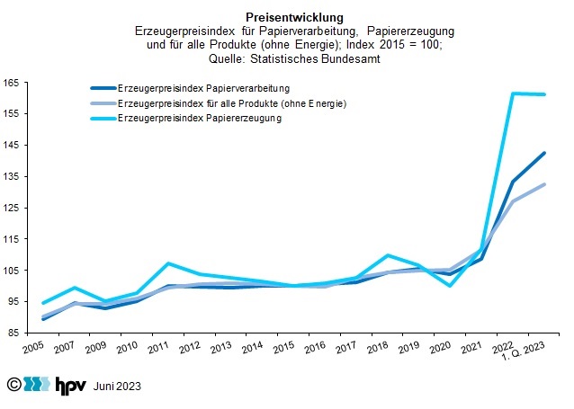 - In der Papiererzeugenden Industrie war die Preisdynamik im Jahr 2022 noch deutlich höher als bei der Papierverarbeitung. Im Jahresdurchschnitt 2022 stieg der Preisindex auf 161,4 und lag somit 44 Prozent über dem Jahresdurchschnitt des Vorjahres. Damit war die Preissteigerungsrate fast doppelt so hoch wie bei der Papierverarbeitung, wo sie in diesem Zeitraum 22,6 Prozent betrug. Gegenüber dem Höchststand im Oktober 2022 – der Preisindex lag damals bei 173,9 – haben die Preise in der Papiererzeugung aber inzwischen wieder deutlich nachgegeben. Im März 2023 lag der Preisindex noch bei 156,3. Für den Durchschnitt des ersten Quartals 2023 ergibt sich ein Index von 161,1. Dies entspricht fast genau dem Durchschnitt des Jahres 2022.