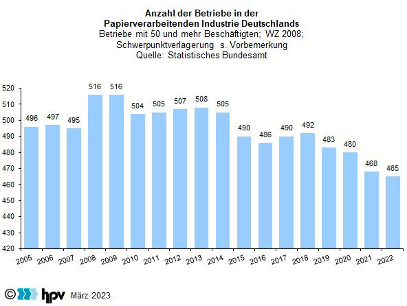 - In der Papierverarbeitenden Industrie gab es im Jahr 2022 insgesamt 465 Betriebe mit mindestens 50 Beschäftigten. Das sind drei weniger als im Jahresdurchschnitt 2021.