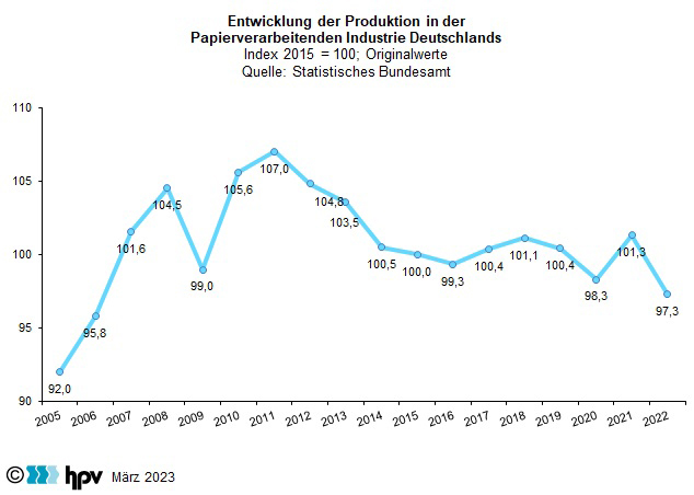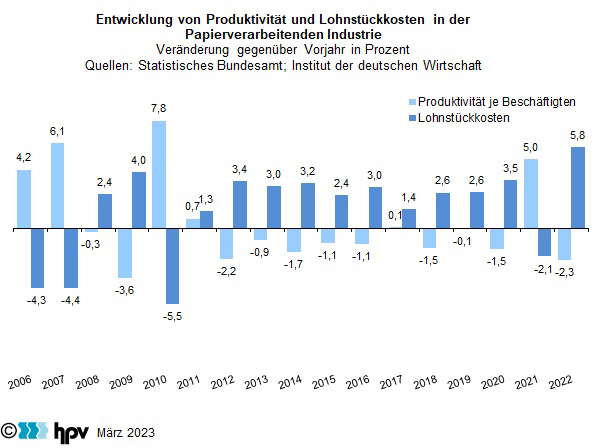 Im Jahr 2022 war die wirtschaftliche Entwicklung in der Papierverarbeitenden Industrie von einer Branchenrezession geprägt. Der Produktionsindex ging gegenüber dem Jahreswert für 2021 unbereinigt um 3,9 Prozent zurück. Kalender- und saisonbereinigt ist der Produktionsindex seit dem vierten Quartal 2021 rückläufig. Gleichzeitig zog der Erzeugerpreisindex der Branche weiter an. Gegenüber dem Jahr 2021 ergibt sich im Jahr 2022 ein Anstieg von 22,6 Prozent. Damit beruhen die Umsatzzuwächse der Branche in Höhe von 16,9 Prozent allein auf Preiserhöhungen. Die Produktivität je Beschäftigten schrumpfte 2022 im Vergleich zum Vorjahr um 2,3 Prozent. Die Lohnstückkosten stiegen aufgrund der sinkenden Produktivität und steigender Bruttolöhne um 5,8 Prozent.