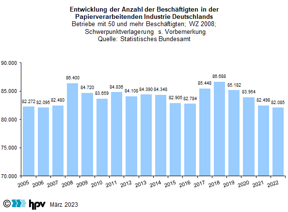 - Die Anzahl der Beschäftigten in der Papierverarbeitenden Industrie ist seit dem Höchststand von 2018 weiterhin rückläufig. Allerdings hat sich der Rückgang zuletzt abgeschwächt. Waren im Durchschnitt des Jahres 2021 noch 82.498 Personen beschäftigt, waren es im Jahr 2022 mit 82.085 etwas weniger Personen. Gegenüber dem Jahr 2018 stellt dies einen Rückgang um 5,3 Prozent dar.