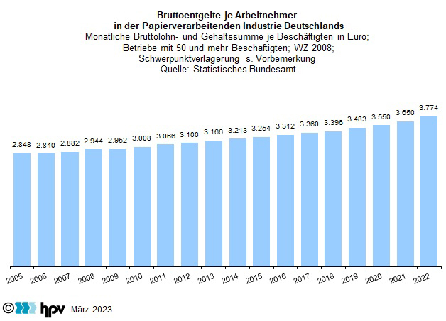 - Das monatliche Bruttoentgelt je Mitarbeiter belief sich in der Papierverarbeitenden Industrie im Jahresdurchschnitt 2022 auf 3.774 Euro. Gegenüber dem Vorjahr bedeutet dies einen Anstieg von 124 Euro oder um 3,4 Prozent.