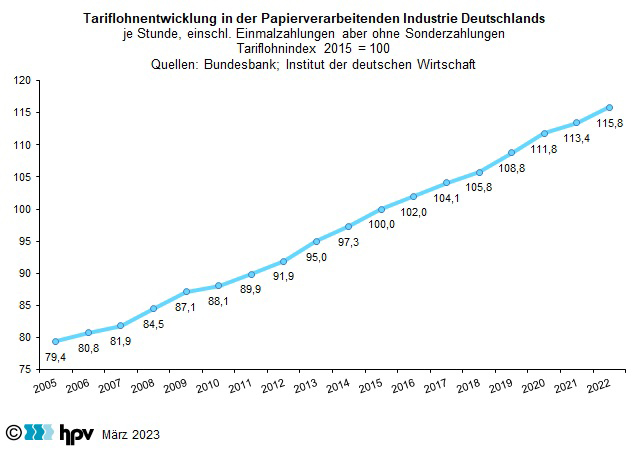 - Nach Berechnungen der Deutschen Bundesbank ergab sich für die Papierverarbeitende Industrie kalenderjährlich und je Stunde gerechnet im Jahr 2021 eine Kostenbelastung von 1,5 Prozent und 2022 eine von 2,1 Prozent. Im gesamtwirtschaftlichen Durchschnitt lagen die Belastungen bei 1,6 und 2,7 Prozent.