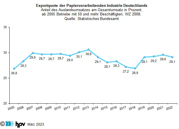 - In relativer Betrachtung haben die Auslandsmärkte für die deutsche Papierverarbeitende Industrie im Jahr 2022 mit einer Exportquote von 29,1 Prozent gegenüber dem Vorjahr leicht an Bedeutung verloren. Dennoch blieb der Anteil des Auslandsumsatzes am Gesamtumsatz ungefähr auf dem Niveau der letzten Jahre, denn in den Jahren 2019 und 2020 lag die Exportquote in etwa genauso hoch wie 2022.