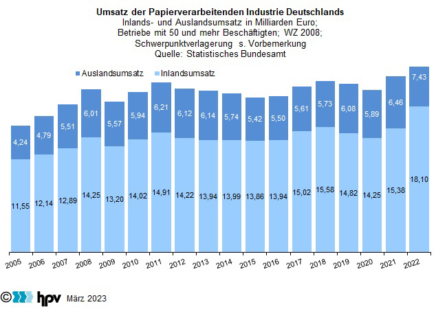 - Im Jahr 2022 lag der Gesamtumsatz in der Papierverarbeitenden Industrie bei 25,53 Milliarden Euro. Gegenüber dem Umsatz des gleichen Vorjahreszeitraums ergab sich ein Plus von 3,69 Milliarden Euro. Dabei belief sich der Inlandsumsatz auf 18,10 Milliarden Euro und der Auslandsumsatz auf 7,43 Milliarden Euro. Damit hat sich der Inlandsumsatz (+17,7 Prozent) stärker als der Auslandsumsatz (+14,9 Prozent) erhöht. Dementsprechend lag der Anteil der Inlandsumsätze am Gesamtumsatz im Jahr 2022 etwas höher als im selben Zeitraum des Vorjahres (70,9 gegenüber 70,4 Prozent).