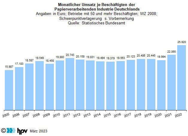 - Aufgrund der großen Preiseffekte lag der Umsatz je Mitarbeiter in der deutschen Papierverarbeitenden Industrie im Jahr 2022 bei durchschnittlich 25.920 Euro. Das stellt einen Rekord dar. Das Niveau lag damit um 17,5 Prozent über dem Niveau des entsprechenden Vorjahreszeitraums. Dabei ist zu berücksichtigen, dass hier vor allem Preiseffekte eine Rolle spielen. Im ersten Halbjahr 2021 war der Preiseffekt noch gering und auch im zweiten Halbjahr 2021 stiegen die Preise moderater als 2022.
