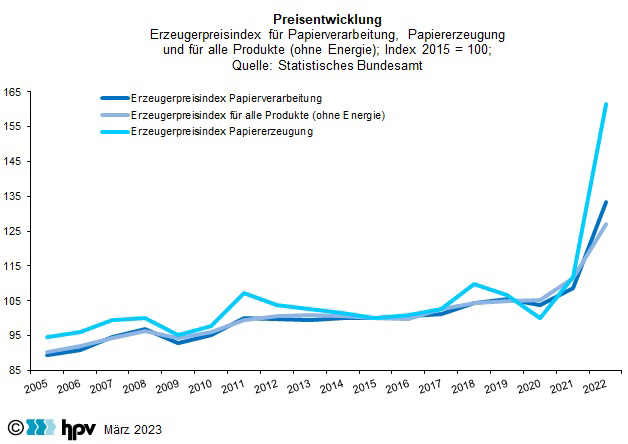 - In der langfristigen Betrachtung verlaufen die Preise für den Gesamtindex der gewerblichen Produkte ohne Energie und den Erzeugnissen der Papierverarbeitung annähernd parallel. Im Jahresdurchschnitt 2022 lag der Gesamtindex der gewerblichen Produkte ohne Energie bei 127,1 nach 111,5 im Jahr 2021 und 105,1 im Jahr 2020.