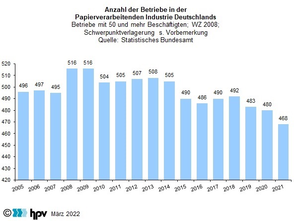 - In der Papierverarbeitenden Industrie gab es im Jahr 2021 insgesamt 468 Betriebe mit mindestens 50 Beschäftigten. Damit setzte sich der leichte Abwärtstrend der letzten Jahre fort.