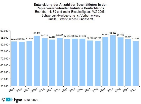 - Die Anzahl der Beschäftigten war in der Papierverarbeitenden Industrie 2021 im dritten Jahr infolge rückläufig. Im Durchschnitt des Jahres 2021 zählte die Papierverarbeitende Industrie 82.498 Beschäftigte. Im Vergleich zum Jahr 2020, in dem durchschnittlich 83.954 Personen beschäftigt waren, entspricht dies einem Beschäftigungsrückgang von 1,8 Prozent. Gegenüber dem Beschäftigungshöchststand im Jahr 2018 hat sich die Zahl der abhängig Beschäftigten deutlich – um 4.190 – verringert. Das entspricht einem Rückgang von 4,8 Prozent.