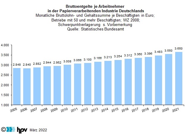 - Der monatliche Bruttolohn beziehungsweise das monatliche Bruttogehalt je Mitarbeiter belief sich in der Papierverarbeitenden Industrie im Durchschnitt des Jahres 2021 auf 3.650 Euro. Gegenüber 2020 bedeutet dies einen deutlichen Anstieg von 100 Euro oder 2,8 Prozent.