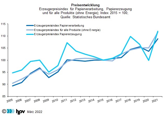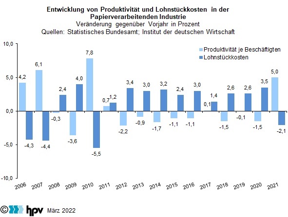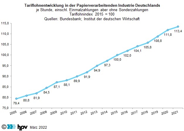 - Im Jahr 2021 sind die Verbraucherpreise gegenüber 2020 um 3,1 Prozent gestiegen. Damit konnte in der Papierverarbeitenden Industrie – je Arbeitnehmer gerechnet – das Niveau des Reallohns fast gehalten werden. Vergleicht man 2021 mit 2019 – dem Jahr vor der Pandemie – ergibt sich insgesamt ein Reallohnanstieg von 1,1 Prozent.