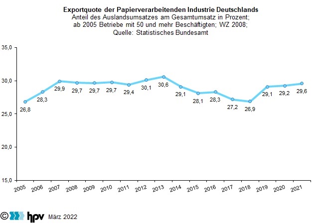 - Die Auslandsmärkte haben für die deutsche Papierverarbeitende Industrie in den Jahren 2019 und 2020 wieder an Bedeutung gewonnen. Dieser Trend hat sich auch 2021 fortgesetzt. Die Exportquote, also der Anteil der Auslandsumsätze am Gesamtumsatz, stieg im Durchschnitt des Jahres 2021 auf 29,6 Prozent. Das bedeutet ein Plus von 0,4 Prozentpunkten gegenüber dem Jahresdurchschnittswert 2020.