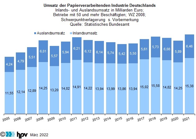 - Im Jahr 2021 lag der Gesamtumsatz in der Papierverarbeitenden Industrie bei 21,84 Milliarden Euro. Gegenüber dem Umsatz 2020 (20,14 Milliarden Euro) ergab sich ein deutliches Plus von 1,7 Milliarden Euro. Das entspricht einem Zuwachs von 8,4 Prozent. Der Inlandsumsatz belief sich 2021 auf 15,38 Milliarden Euro und der Auslandsumsatz auf 6,46 Milliarden Euro. Im Vergleich zum Vorjahr zeigt sich bei beiden Indikatoren ein deutliches Plus, wobei das Plus im Ausland mit 9,7 Prozent etwas größer als das Plus im Inland (7,9 Prozent) ausfiel. Dadurch ging der Anteil der Inlandsumsätze am Gesamtumsatz mit 70,4 Prozent gegenüber dem Vorjahr (70,8 Prozent) leicht zurück.