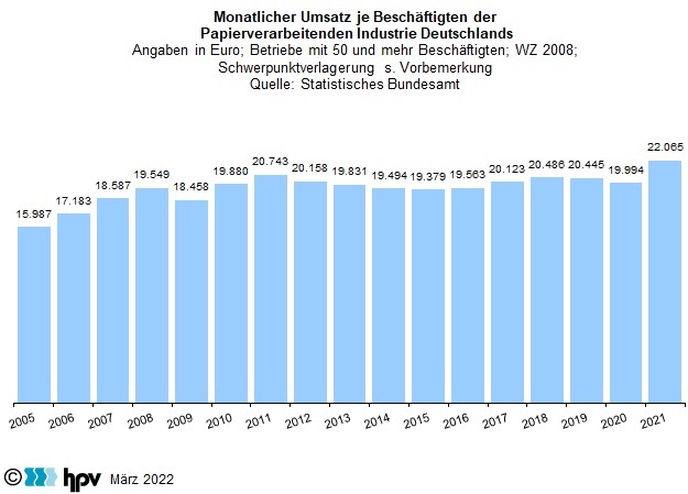 - Im Jahr 2021 lag der Umsatz je Mitarbeiter in der deutschen Papierverarbeitenden Industrie bei durchschnittlich 22.065 Euro. Das Niveau lag damit um 10,4 Prozent über dem Niveau des entsprechenden Vorjahreszeitraums. Der Pro-Kopf-Umsatz wuchs prozentual stärker als der nominale Umsatz, weil 2021 Beschäftigung abgebaut wurde.