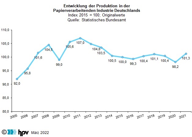- In den ersten vier Monaten des Jahres 2021 herrschte für die Bevölkerung ein strenger Lockdown. Dadurch fiel die Produktion in der Papierverarbeitenden Industrie im ersten Quartal 2021 unbereinigt um 3,5 Prozent niedriger aus als im ersten Quartal 2020, das noch weitgehend unbelastet von der Corona-Pandemie war. Dieser Rückstand ist inzwischen aufgeholt. Denn im zweiten und dritten Quartal 2021 gab es im Vergleich zum Vorjahr Zuwächse von 7,7 und 6,3 Prozent, im vierten Quartal von immerhin noch 2,8 Prozent, sodass sich im Jahresdurchschnitt 2021 gegenüber dem Jahresmittel 2020 ein Anstieg von unbereinigt 3,2 Prozent ergibt.