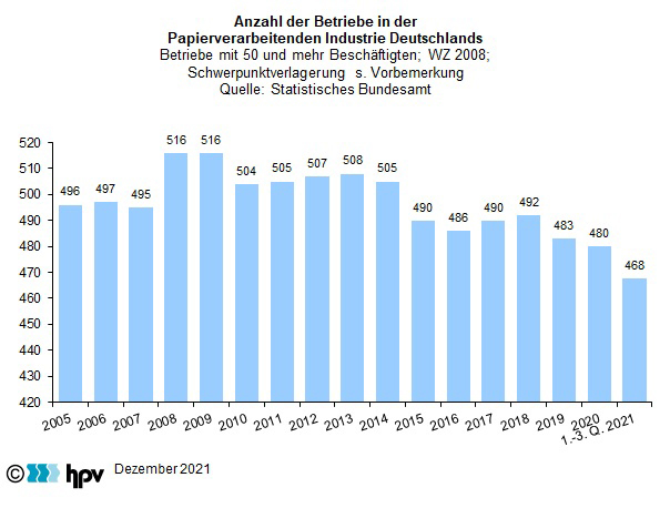 - In der Papierverarbeitenden Industrie gab es bis September 2021 insgesamt 468 Betriebe mit mindestens 50 Beschäftigten. Damit setzte sich der leichte Abwärtstrend der letzten Jahre fort.