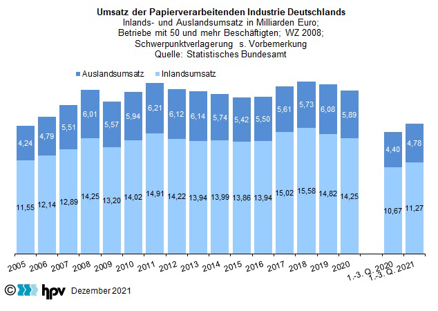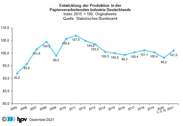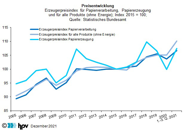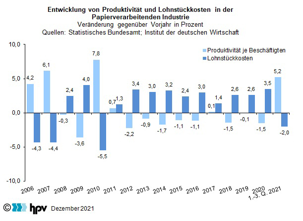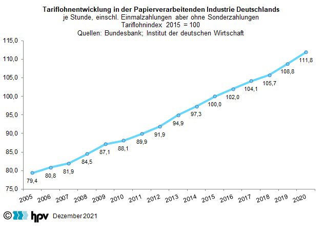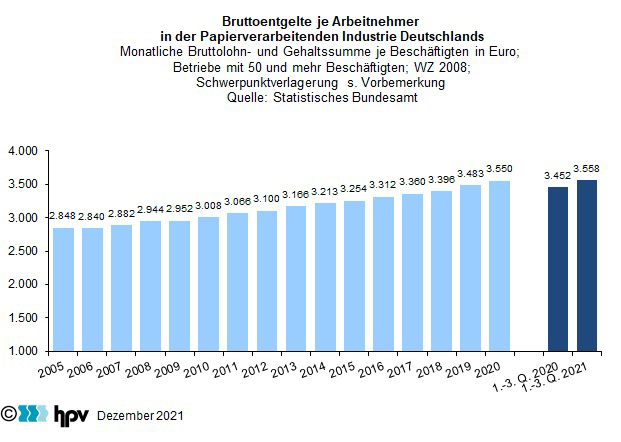 - Im Laufe der ersten drei Quartale des Jahres 2021 sind die Verbraucherpreise gegenüber dem entsprechenden Vorjahreszeitraum um 2,5 Prozent gestiegen. Damit konnte in der Papierverarbeitenden Industrie – je Arbeitnehmer gerechnet – ein Reallohnzuwachs von 0,5 Prozent erzielt werden.