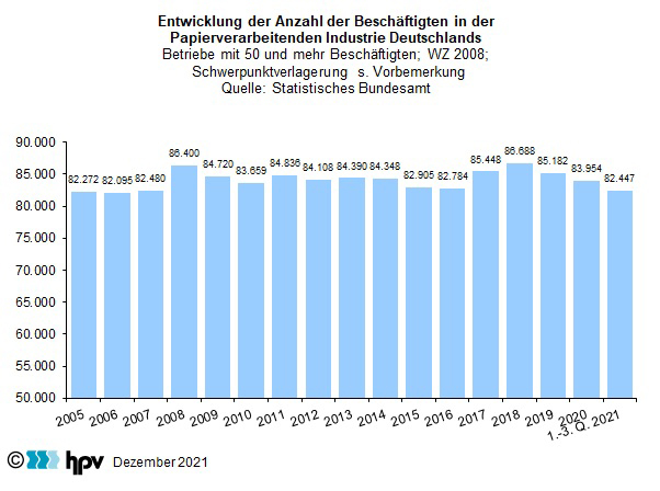 - Nach der Entwicklung in den ersten drei Quartalen deutet sich an, dass die Beschäftigung in der Papierverarbeitenden Industrie auch 2021 weiterhin zurückgehen wird. Im Durchschnitt der ersten drei Quartale 2021 zählte die Papierverarbeitende Industrie 82.447 Beschäftigte. Im Vergleich zum Jahr 2020, in dem durchschnittlich 83.954 Personen beschäftigt waren, entspricht dies einem Beschäftigungsrückgang von 1,8 Prozent. Gegenüber dem Beschäftigungshöchststand im Jahr 2018 hat sich die Zahl der abhängig Beschäftigten deutlich – um 4.242 – vermindert. Das entspricht einem Rückgang von 4,9 Prozent.