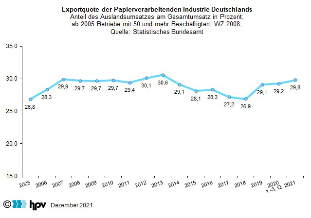 - Die Auslandsmärkte haben für die deutsche Papierverarbeitende Industrie in den Jahren 2019 und 2020 wieder an Bedeutung gewonnen. Dieser Trend hat sich auch in den ersten drei Quartalen 2021 fortgesetzt. Die Exportquote, also der Anteil der Auslandsumsätze am Gesamtumsatz, stieg im Durchschnitt dieses Zeitraums auf 29,8 Prozent. Das bedeutet ein Plus von 0,6 Prozentpunkten gegenüber dem Jahresdurchschnittswert 2020.