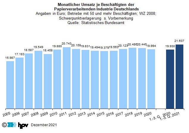 - In den ersten drei Quartalen des laufenden Jahres lag der Umsatz je Mitarbeiter in der deutschen Papierverarbeitenden Industrie bei durchschnittlich 21.637 Euro. Das Niveau lag damit um 8,6 Prozent über dem Niveau des entsprechenden Vorjahreszeitraums. Dabei ist zu berücksichtigen, dass die Auswirkungen der Pandemie im ersten Lockdown 2020 stärker ausfielen als im zweiten Lockdown 2020/21.