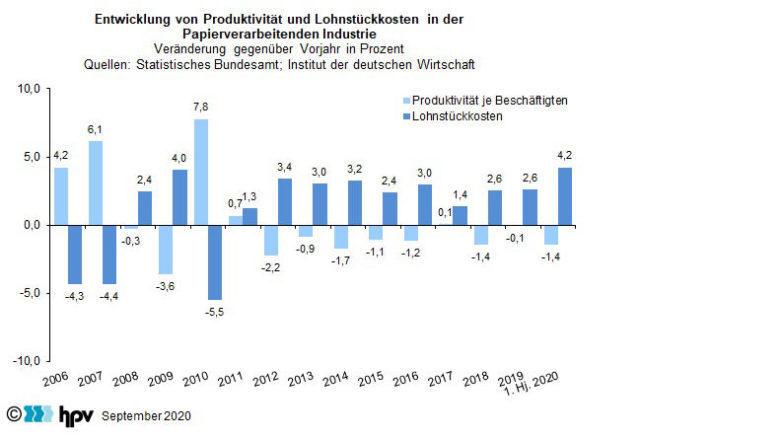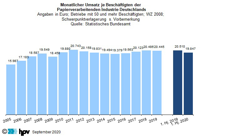 - Im Durchschnitt der ersten sechs Monate des Jahres 2020 belief sich der Umsatz je Mitarbeiter in der deutschen Papierverarbeitenden Industrie auf 19.847 Euro. Diese Leistungskennziffer liegt nunmehr deutlich unter dem Niveau des entsprechenden Vorjahreszeitraums als auch unter dem Jahresdurchschnitt von 2019. Bei diesem Indikator ist ein langfristiger Vergleich insofern möglich, weil durch die Statistikumstel- lung sowohl die Umsatz- als auch die Beschäftigungsdaten angepasst werden.