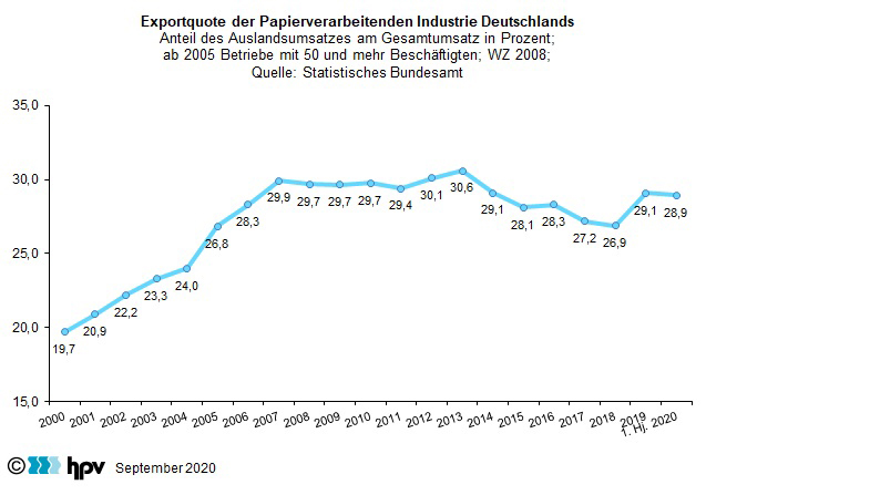 Im Durchschnitt der ersten sechs Monate dieses Jahres belief sich die Exportquote der Papierverarbeitenden Industrie auf knapp 29 Prozent. Das ist etwas niedriger als im Jahresdurchschnitt 2019, aber ganz leicht über dem Niveau des ersten Halbjahres 2019. Im langfristigen Vergleich sind anhand der Exportquote deutliche Veränderun- gen in der Umsatzstruktur der deutschen Papierverarbeitenden Industrie zu erken- nen. Zur Jahrtausendwende hatten die Auslandsumsätze ein Gewicht von rund 20 Prozent. Von 2007 bis 2013 notierte die Exportquote bei fast 30 Prozent.