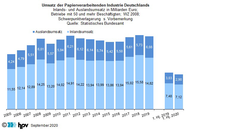 - Der Umsatz der deutschen Papierverarbeitenden Industrie lag im ersten Halbjahr 2020 bei 10 Milliarden Euro. Das waren knapp eine halbe Milliarde Euro oder 4,7 Prozent weniger als im gleichen Vorjahreszeitraum. Während sich die Einbußen im ersten Quartal 2020 auf 1,2 Prozent gegenüber Vorjahr beliefen, war im zweiten Quartal ein Umsatzrückgang binnen Jahresfrist von knapp 8,5 Prozent zu verkraften. Ein kleiner Teil des Rückgangs beruht auf den statistischen Umstellungen zum Jahreswechsel. Durch sie werden in der Branche weniger Betriebe verbucht, was sich entsprechend in einem niedrigeren Umsatz niederschlagen kann.