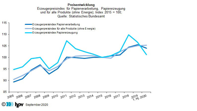 - Während in der gesamten Industrie (ohne Energieerzeugung) die Erzeugerpreise zu- mindest beim Blick auf das erste Halbjahr 2020 noch ganz leicht über dem Vorjah- resniveau notieren, waren in der Papierverarbeitenden und insbesondere in der Papiererzeugenden Industrie bereits deutliche Preisanpassungen zu verzeichnen.