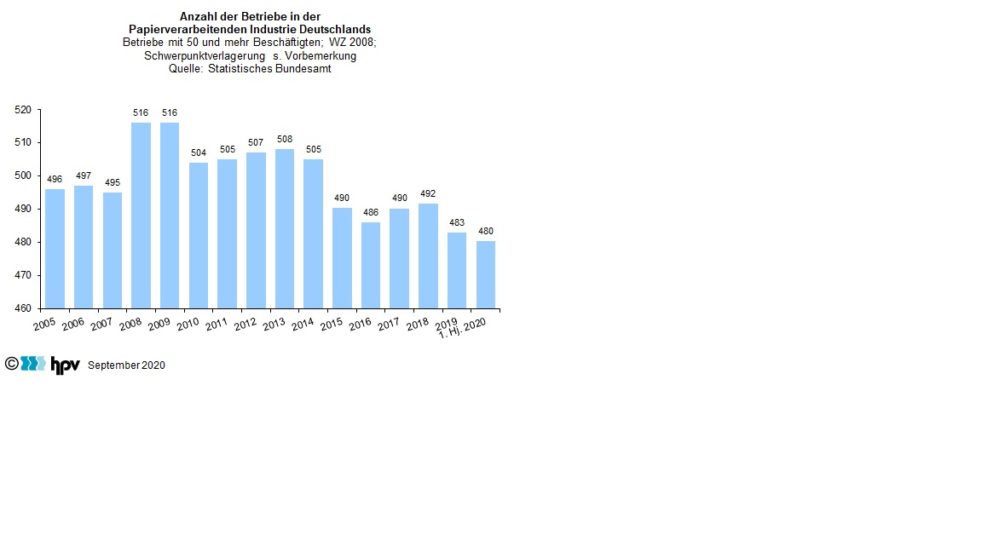 - Im deutschen Verarbeitenden Gewerbe unterschritt die Produktion im ersten Halbjahr 2020 das Vorjahresniveau um 22,5 Prozent. In der Papierverarbeitenden Industrie insgesamt waren die Einbrüche weniger stark ausgeprägt. Im Vorjahresvergleich gab die Produktion hier um 5,4 Prozent nach. Einzelne Teilbranchen hatten aber deutlich stärkere Einbrüche.