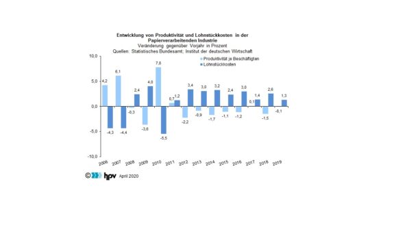 - Die Produktivität je Beschäftigten hat sich im Jahr 2019 gegenüber dem Vorjahr kaum verändert (minimaler Rückgang um 0,1 Prozent). Damit hat es in der Papierverarbeitenden Industrie seit 2012 je Beschäftigten gerechnet keine nennenswerten Produktivitätsanstiege mehr gegeben. In sechs dieser acht Jahre gab es klare Rückgänge; lediglich in den Jahren 2017 und 2019 stagnierte die Produktivität je Beschäftigten.