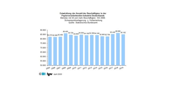 - Die konjunkturelle Abschwächung hat sich negativ auf die Beschäftigung in der deutschen Papierverarbeitenden Industrie im Jahr 2019 ausgewirkt. Im Jahresdurchschnitt zählte die Branche 85.182 Beschäftigte. Im Vergleich zum Vorjahr waren 1.506 Personen weniger beschäftigt. Das entspricht einem Beschäftigungsrückgang von 1,7 Prozent. Gegenüber dem Beschäftigungshöchststand vom Oktober 2018 hat sich die Beschäftigung bis Dezember 2019 um 3.107 Personen oder 3,6 Prozent vermindert.