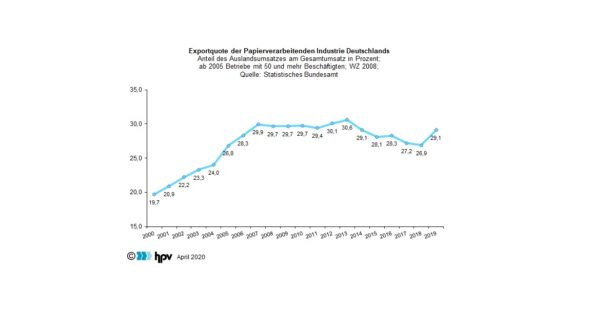 - Im Zuge dieser Abwärtsentwicklung ließ sich seit 2013 auch eine Strukturverlagerung bei den Umsätzen in der Papierverarbeitenden Industrie beobachten – tendenziell weg vom Auslandsumsatz und wieder stärker hin zum Inlandsgeschäft. Dieser Trend hat sich 2019 aber nicht weiter fortgesetzt. Im Jahresdurchschnitt lag der Anteil der Auslandsumsätze an den Gesamtumsätzen der Branche in der Papierverarbeitenden Industrie bei 29,1 Prozent, verglichen mit 26,9 Prozent im Jahr 2018. Das ist ein spürbarer Anstieg von 2,2 Prozentpunkten.