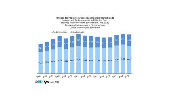 - Im Jahr 2019 lag der Gesamtumsatz in der Papierverarbeitenden Industrie bei 20,9 Milliarden Euro. Gegenüber dem Umsatz des Vorjahres (21,3 Milliarden Euro) bedeutet dies einen Rückgang in Höhe von 1,9 Prozent. Während von Januar bis Mai 2019 das Vorjahresniveau noch gut gehalten werden konnte, kam es ab dem Frühsommer zu einem ausgeprägten Rückgang.