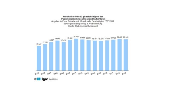 - Der Umsatz je Mitarbeiter hat in der deutschen Papierverarbeitenden Industrie leicht nachgelassen. Im Durchschnitt 2019 belief sich diese Leistungsgröße monatlich auf 20.445 Euro. Das Niveau des entsprechenden Vorjahreszeitraums wurde dabei um 0,2 Prozent unterschritten. Da die Erzeugerpreise der Branche im Jahresdurchschnitt um 1,0 Prozent deutlich über dem Vorjahreswert notierten, sind die preisbereinigten Umsätze je Mitarbeiter in der Papierverarbeitenden Industrie mit 1,2 Prozent sogar noch stärker zurückgegangen.