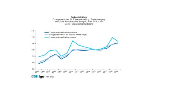 - In der Papierverarbeitenden Industrie war die Entwicklung ähnlich. Dort stiegen die Erzeugerpreise seit dem Jahr 2016 an. Im Jahr 2019 betrug der Preisanstieg im Durchschnitt 1,0 Prozent. Im Vorjahr waren es noch 3,3 Prozent. Auch hier deckelt die schwache Konjunktur die Preisspielräume.
