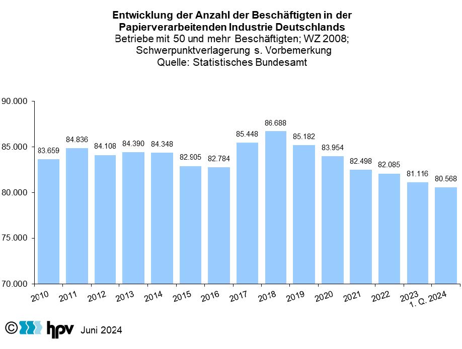 - Die Anzahl der Beschäftigten in der Papierverarbeitenden Industrie ist seit dem Höchststand von 2018 kontinuierlich gesunken. Waren im Durchschnitt des Jahres 2018 noch knapp 87.000 Personen beschäftigt, waren es im Jahresdurchschnitt 2023 nur noch 81.116 und im ersten Quartal 2024 sogar nur noch 80.568 Personen. Aktuell ergibt sich gegenüber dem Vorjahresdurchschnitt ein Minus von 0,7 Prozent, gegen-über dem ersten Quartal 2023 liegt das Minus bei 1,2 Prozent.