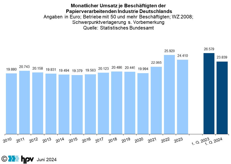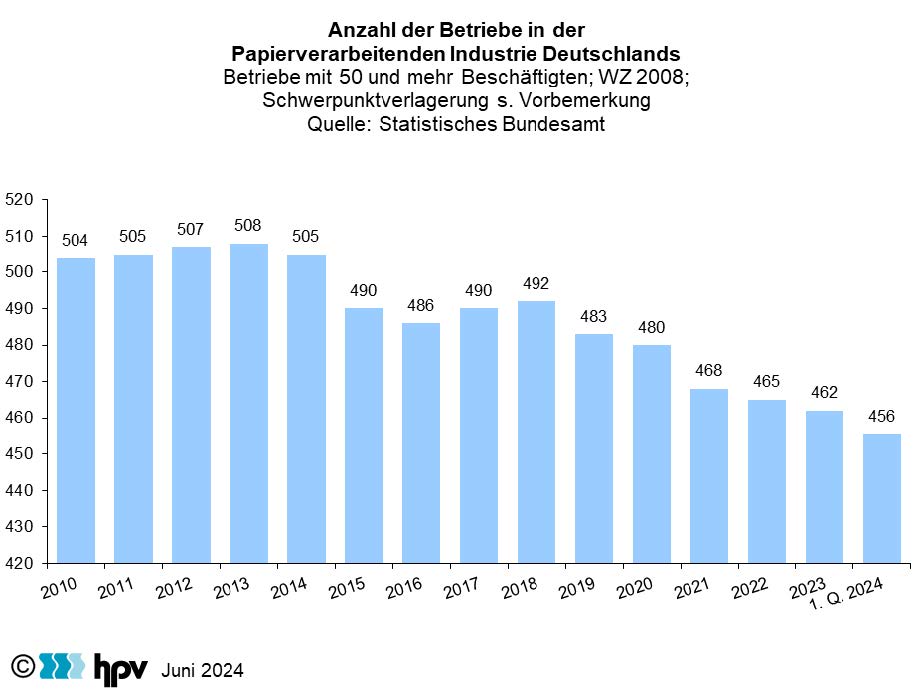 - In der Papierverarbeitenden Industrie gab es im Jahr 2023 insgesamt 462 Betriebe mit mindestens 50 Beschäftigten. Im ersten Quartal 2024 waren es dagegen nur noch 456.